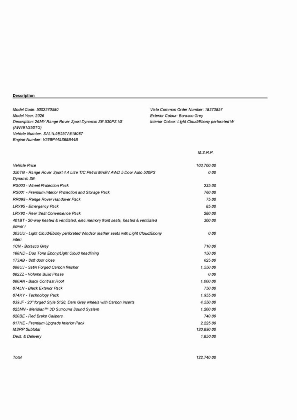 Electric Motor, 20-Way Electric Heated Front Seats with Memory, Black Contrast Roof, Black Exterior Pack, ClearSight Interior Rear View Mirror, Configurable Cabin Lighting, Domestic Plug Socket, Duo Tone Ebony/Light Cloud Headlining, Full Extended Leather Upgrade, Head-Up Display, Park Assist, Premium Upgrade Interior Package, Radio: Meridian 3D Surround Sound System, Red Brake Calipers, Satin Forged Carbon Finisher, Solar Attenuating Windscreen, SV Bespoke Carpet Mats, Technology Pack, Wheels: 23" Forged Dark Grey (style 5128).