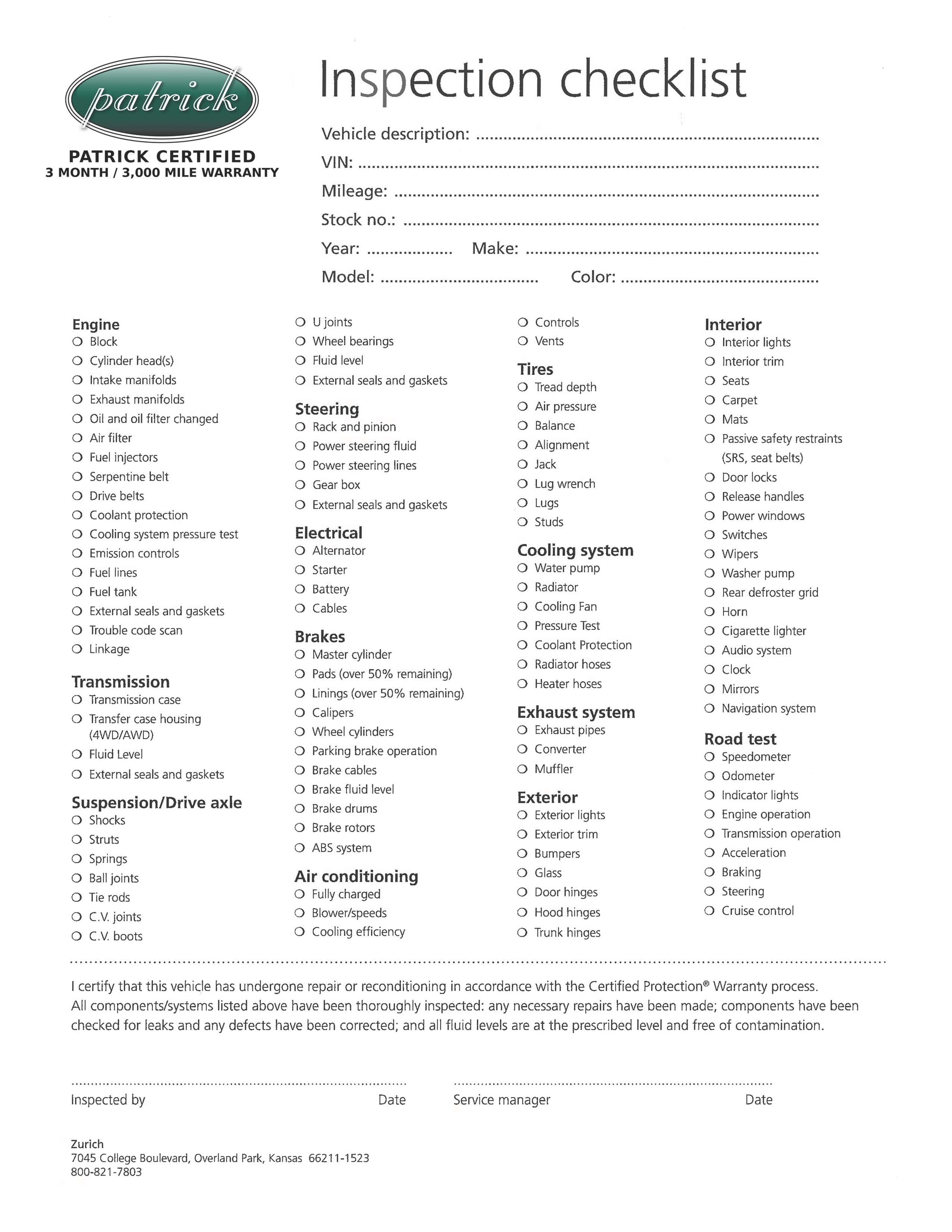 Below is the rigorous inspection checklist that all Patrick Certified Pre-Owned Vehicles go through before they are sold to you! Buy with the peace of mind here at The Patrick Dealer Group knowing you are protected by our 3 month 3,000 mile limited warranty included free of charge!Â